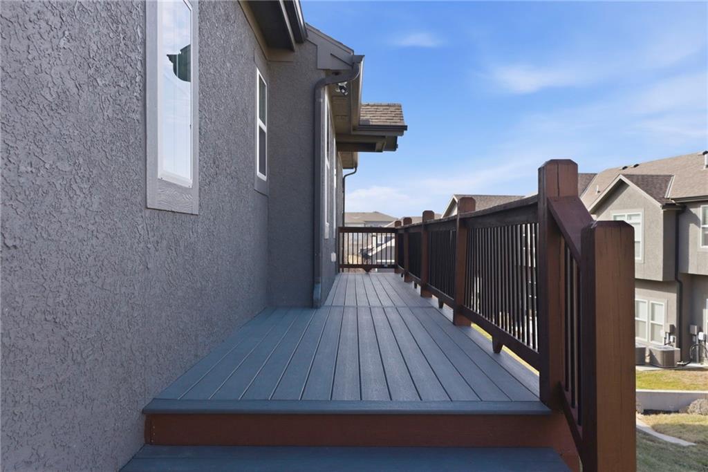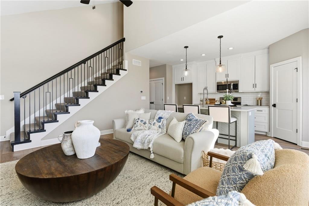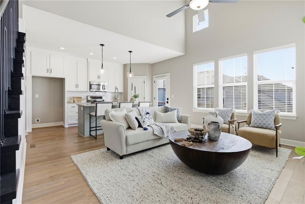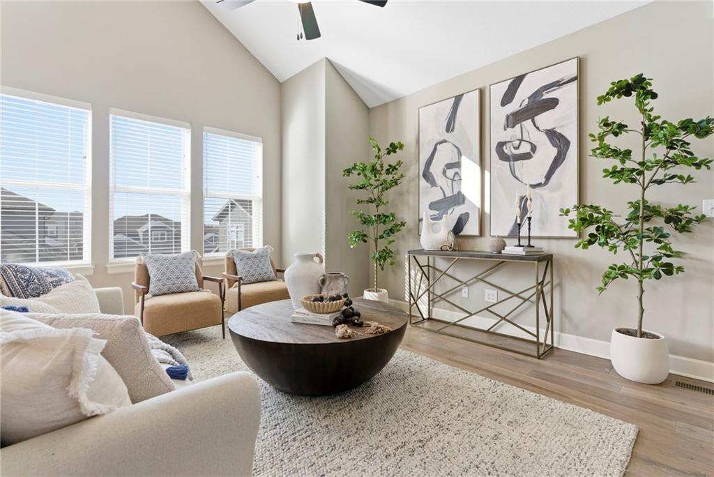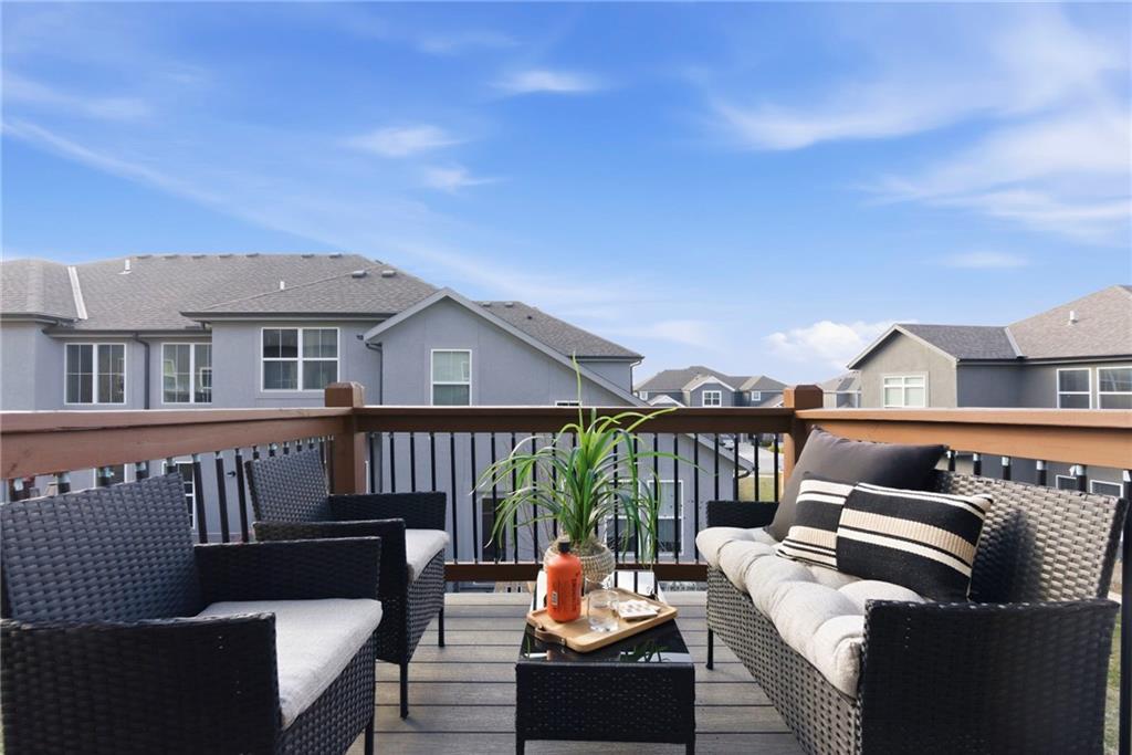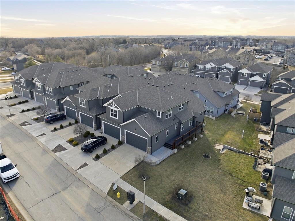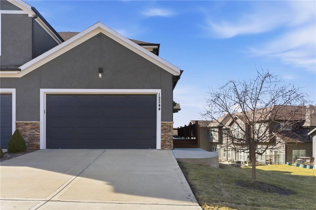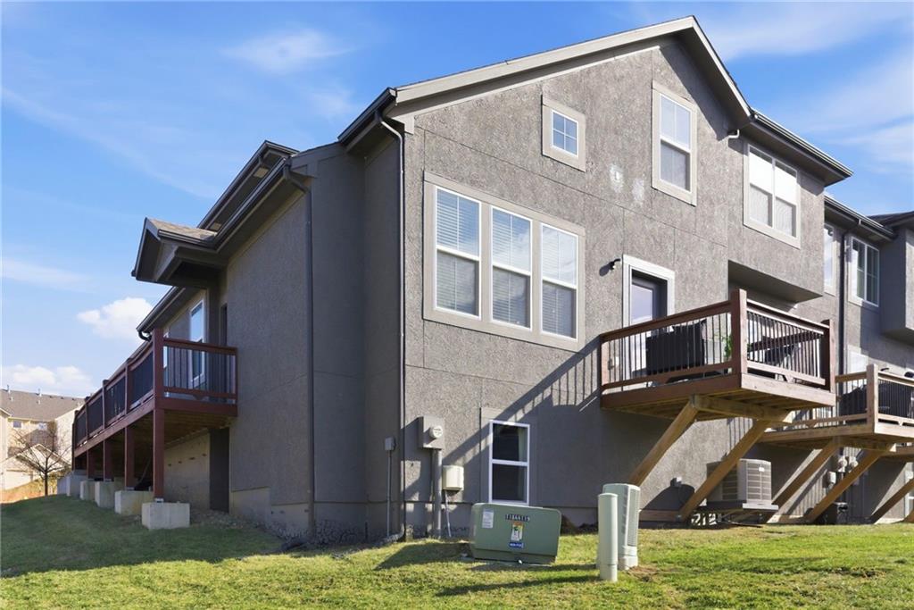 Better than new! So many upgrades in this gorgeous townhome! Located in the highly desirable and convenient community of The Landings at Stone Creek, this 1.5-story home offers privacy as a corner lot in the Olathe school district! Spacious and open with soaring ceilings, a dramatic wall of windows frames the tree-lined scenery and fills the home with natural light. The kitchen features a large quartz island perfect for dining, gathering, or work space, a tiled backsplash, and upgraded custom cabinetry. The main-level primary suite includes a walk-in shower, double vanity, and walk-in closet, along with convenient main-level laundry and a powder room for guests. Upstairs, a huge bonus loft provides flexible space for an office, second living area, or playroom! Extensive upgrades include real hardwood flooring, epoxy garage floors, custom wood blinds, custom cabinetry, upgraded hardware throughout, designer tile selections, newer light fixtures, and a whole-home humidifier! Maintenance-provided living with a low HOA in a sought-after location close to everything! Don't miss it!