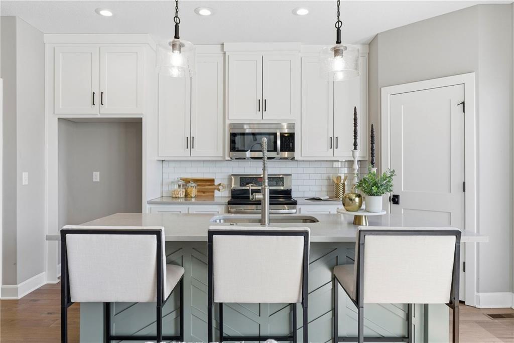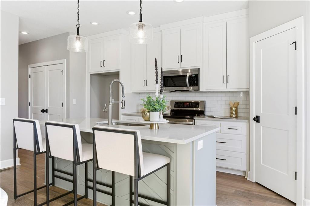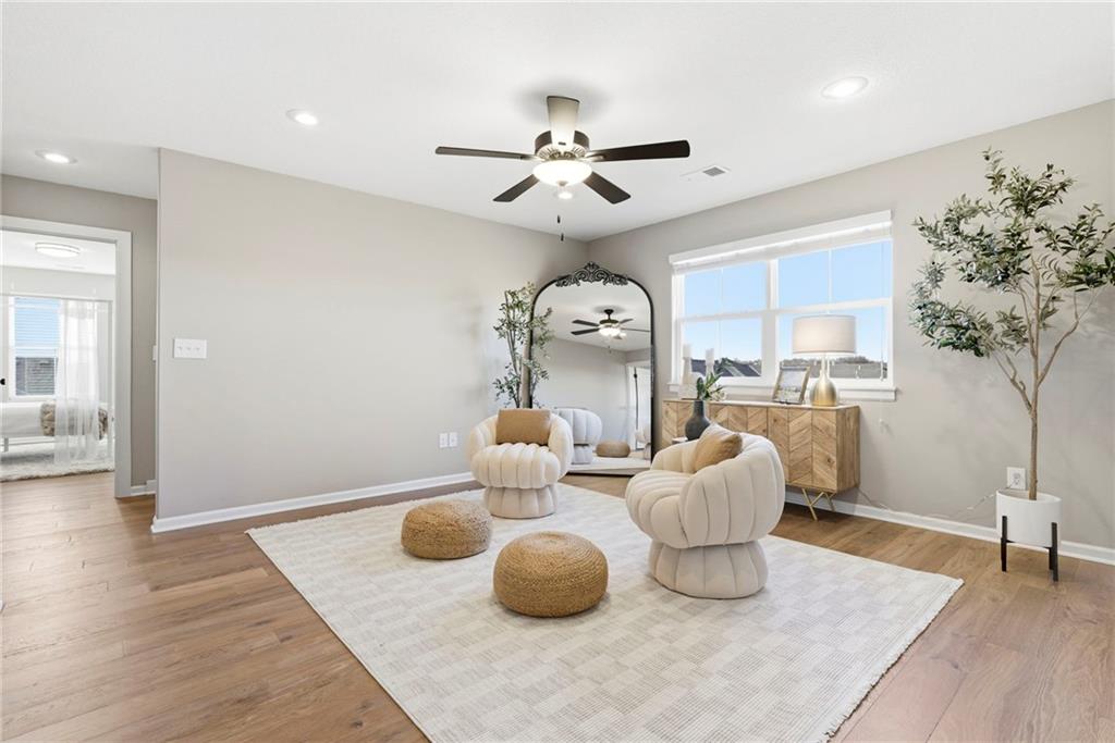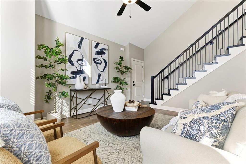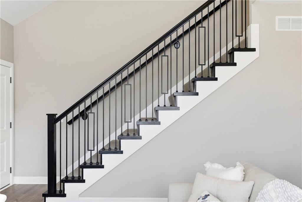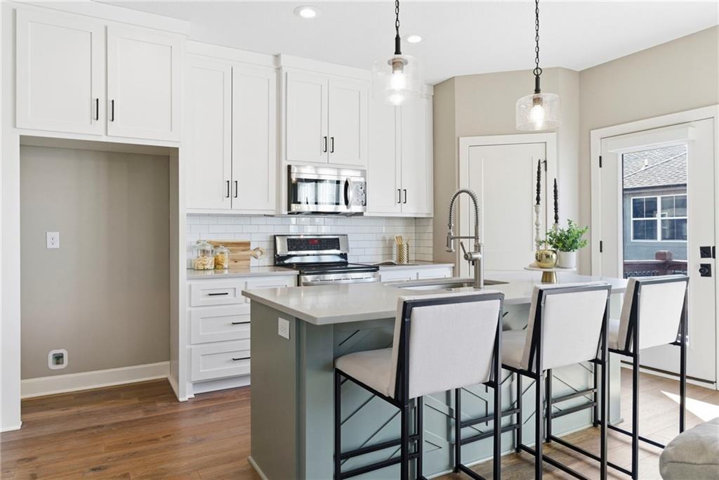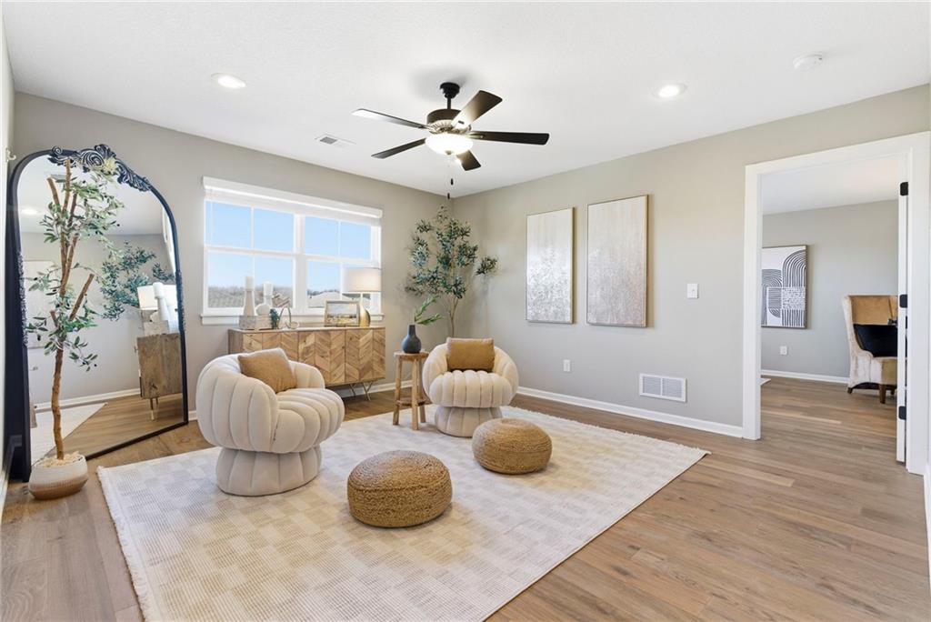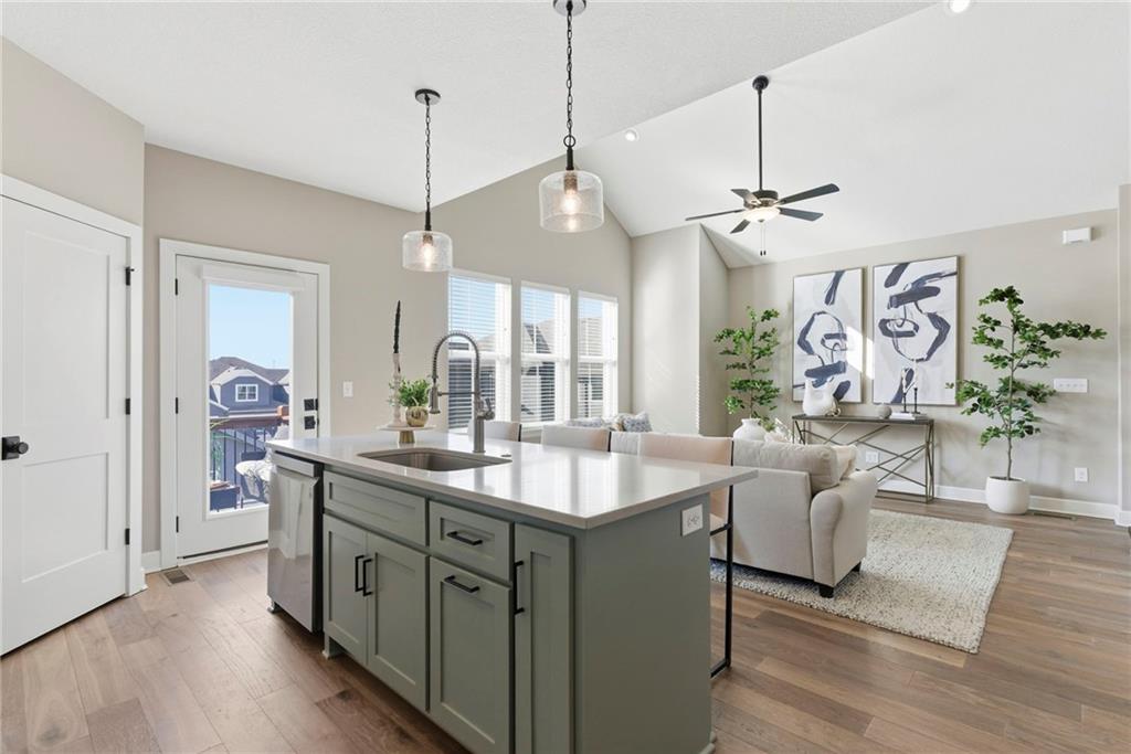 Better than new! So many upgrades in this gorgeous townhome! Located in the highly desirable and convenient community of The Landings at Stone Creek, this 1.5-story home offers privacy as a corner lot in the Olathe school district! Spacious and open with soaring ceilings, a dramatic wall of windows frames the tree-lined scenery and fills the home with natural light. The kitchen features a large quartz island perfect for dining, gathering, or work space, a tiled backsplash, and upgraded custom cabinetry. The main-level primary suite includes a walk-in shower, double vanity, and walk-in closet, along with convenient main-level laundry and a powder room for guests. Upstairs, a huge bonus loft provides flexible space for an office, second living area, or playroom! Extensive upgrades include real hardwood flooring, epoxy garage floors, custom wood blinds, custom cabinetry, upgraded hardware throughout, designer tile selections, newer light fixtures, and a whole-home humidifier! Maintenance-provided living with a low HOA in a sought-after location close to everything! Don't miss it!